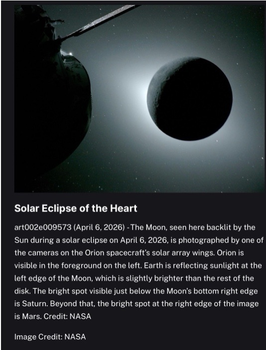 Meanwhile – at the same time, Artemis 2 astronauts, flying on the permanently eclipsed dark side of the moon for the first time ever, send us pictures of a solar eclipse and catches meteorites hitting the moon!(April 6, 2026)